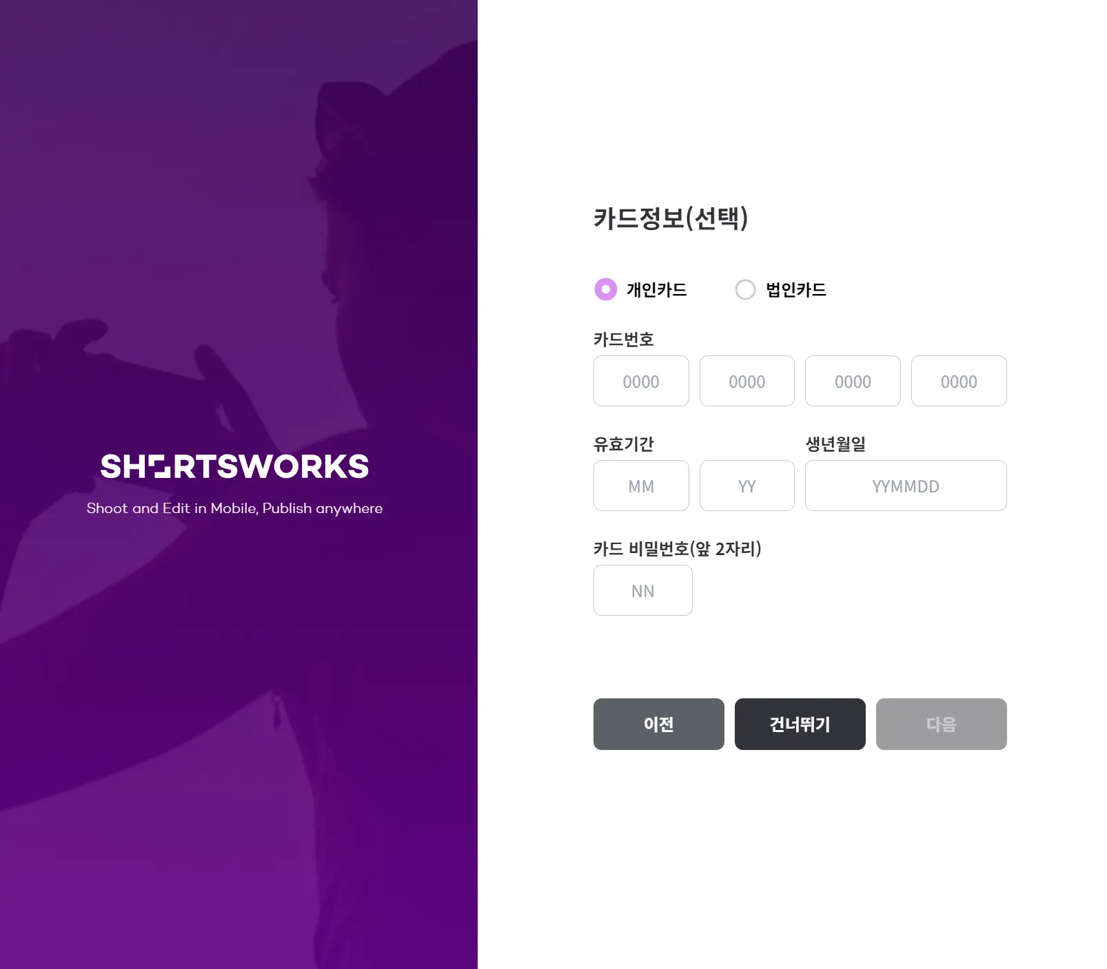 7. 쇼츠웍스에서 사용하실 결제카드 정보를 입력해주세요.