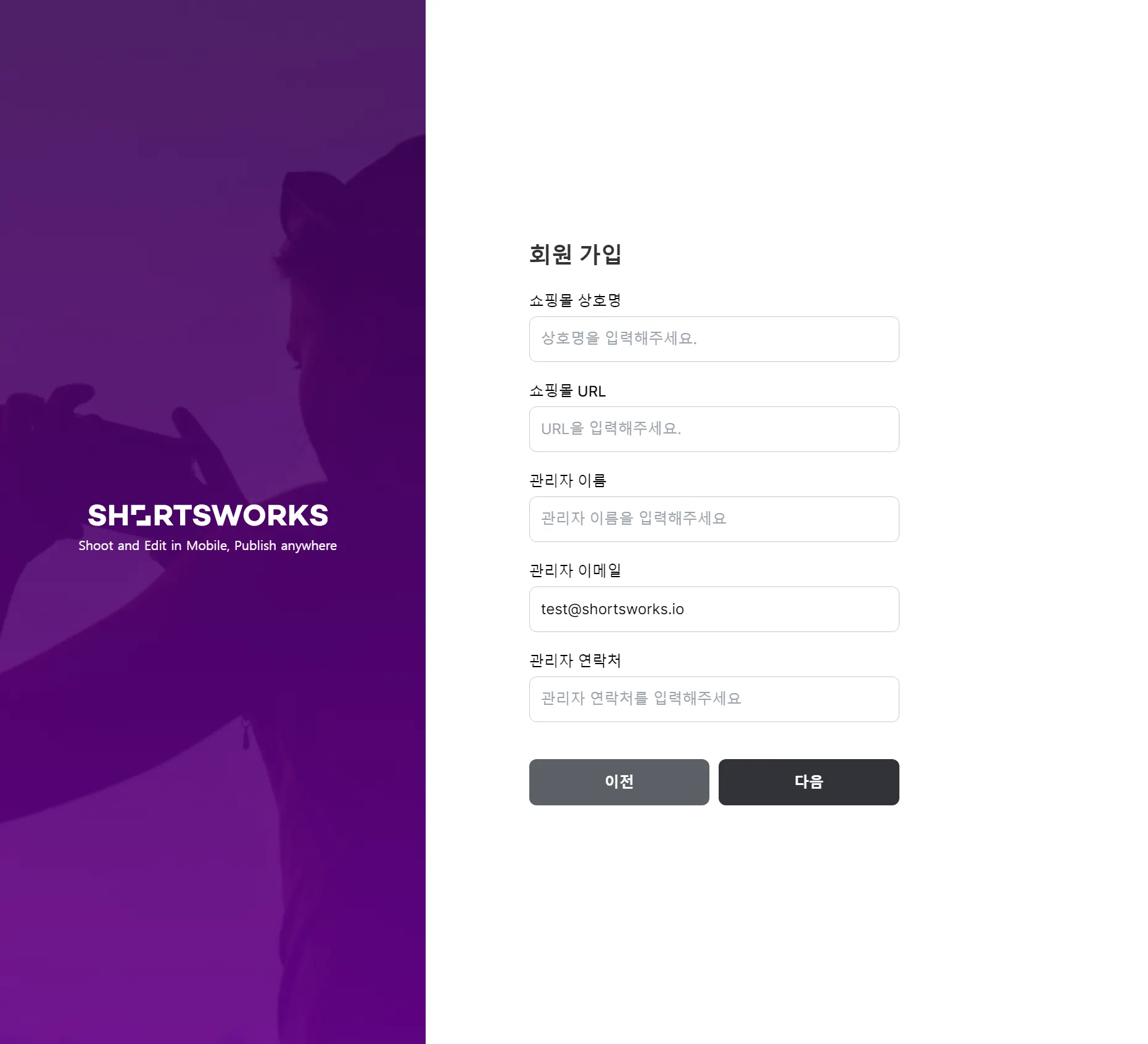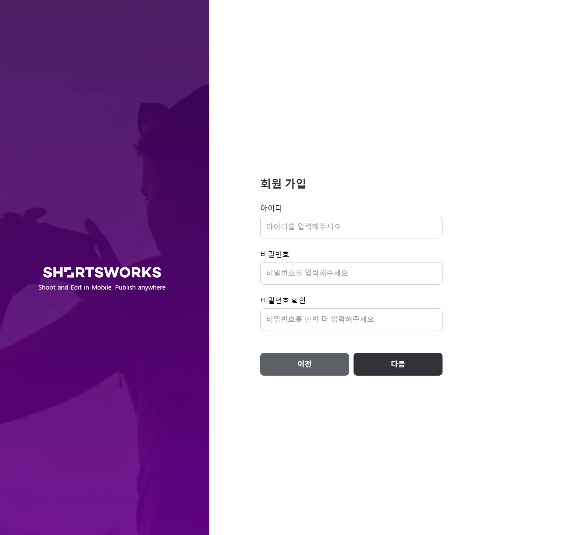 5. 다시 쇼츠웍스 웹사이트로 전환되면 가입하실 아이디와 비밀번호를 입력하세요.