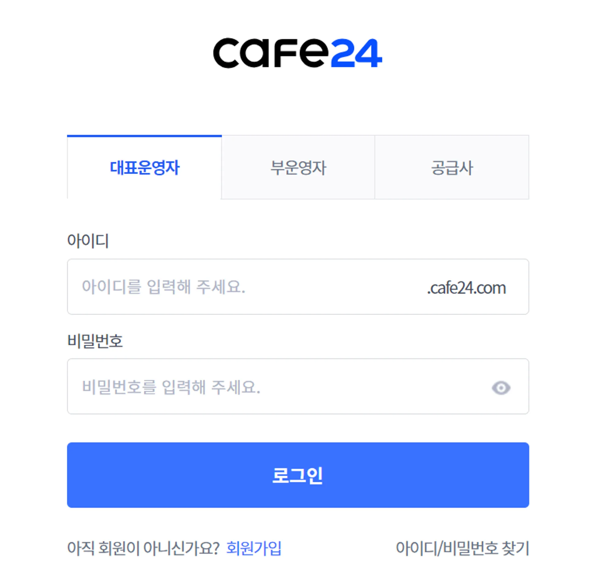 3. Cafe24 로그인 화면으로 전환되면 “대표운영자” 계정 로그인 해주세요.