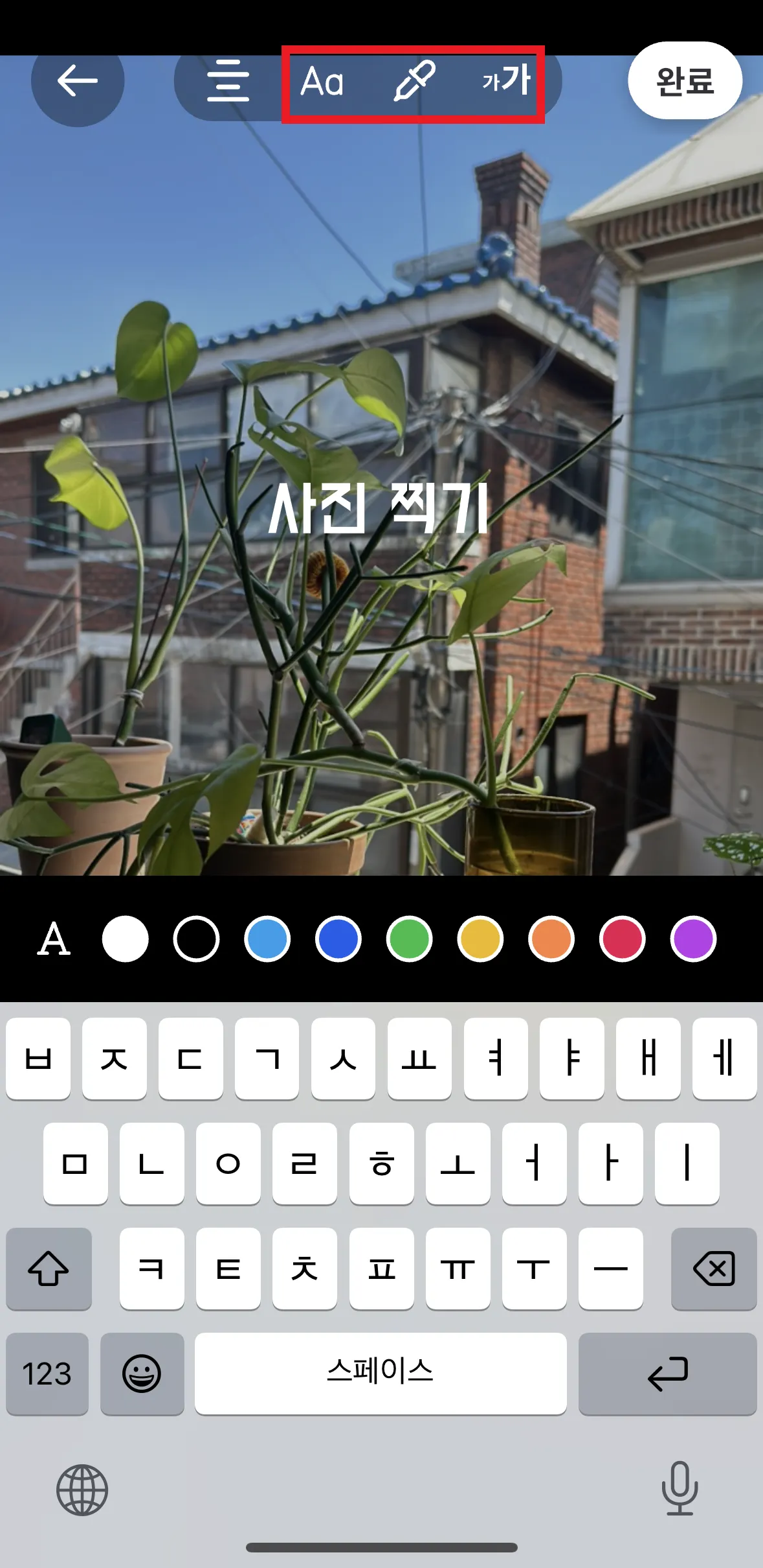 3. 촬영된 사진 확인 후 우측 툴바에서 텍스트 입력, 상품태그, 이모지 추가가 가능합니다.