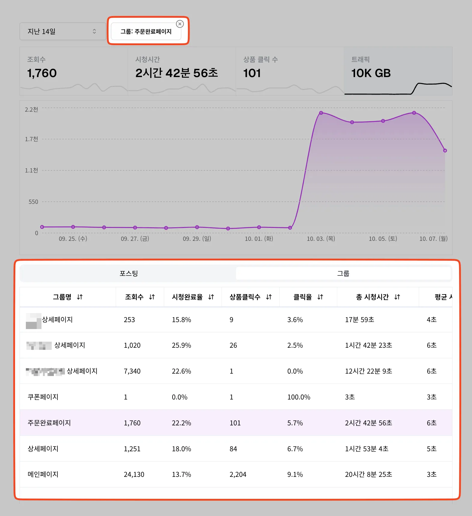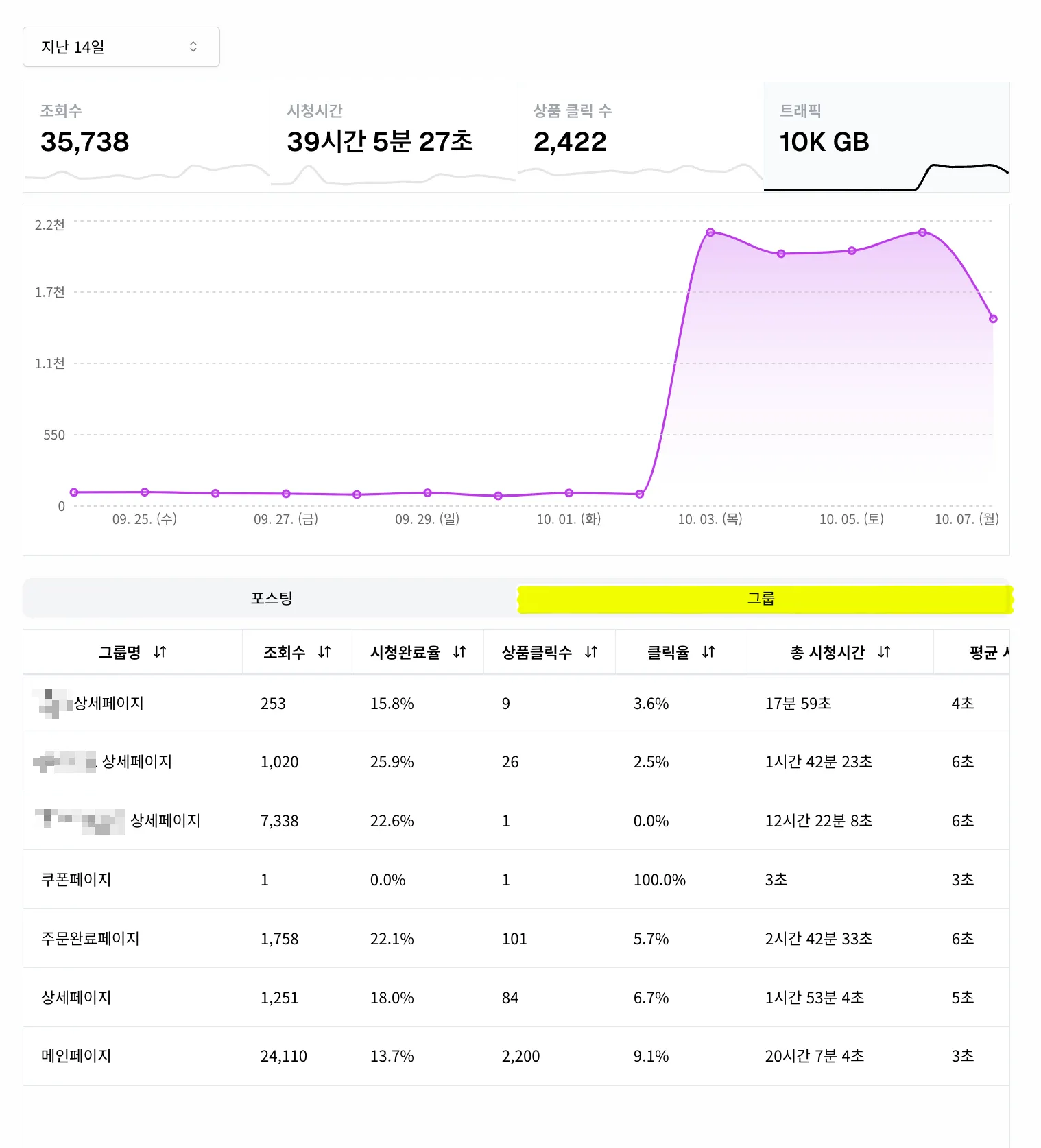 위와 같은 리스트에서 아래 표에서 특정 그룹을 선택하시게 되면 그룹과 관련한 데이터만 상단의 요약에 표시되고, 포스팅 그룹에도 해당 그룹에 해당하는 콘텐츠만 따로 분류해서 보실 수 있습니다.
