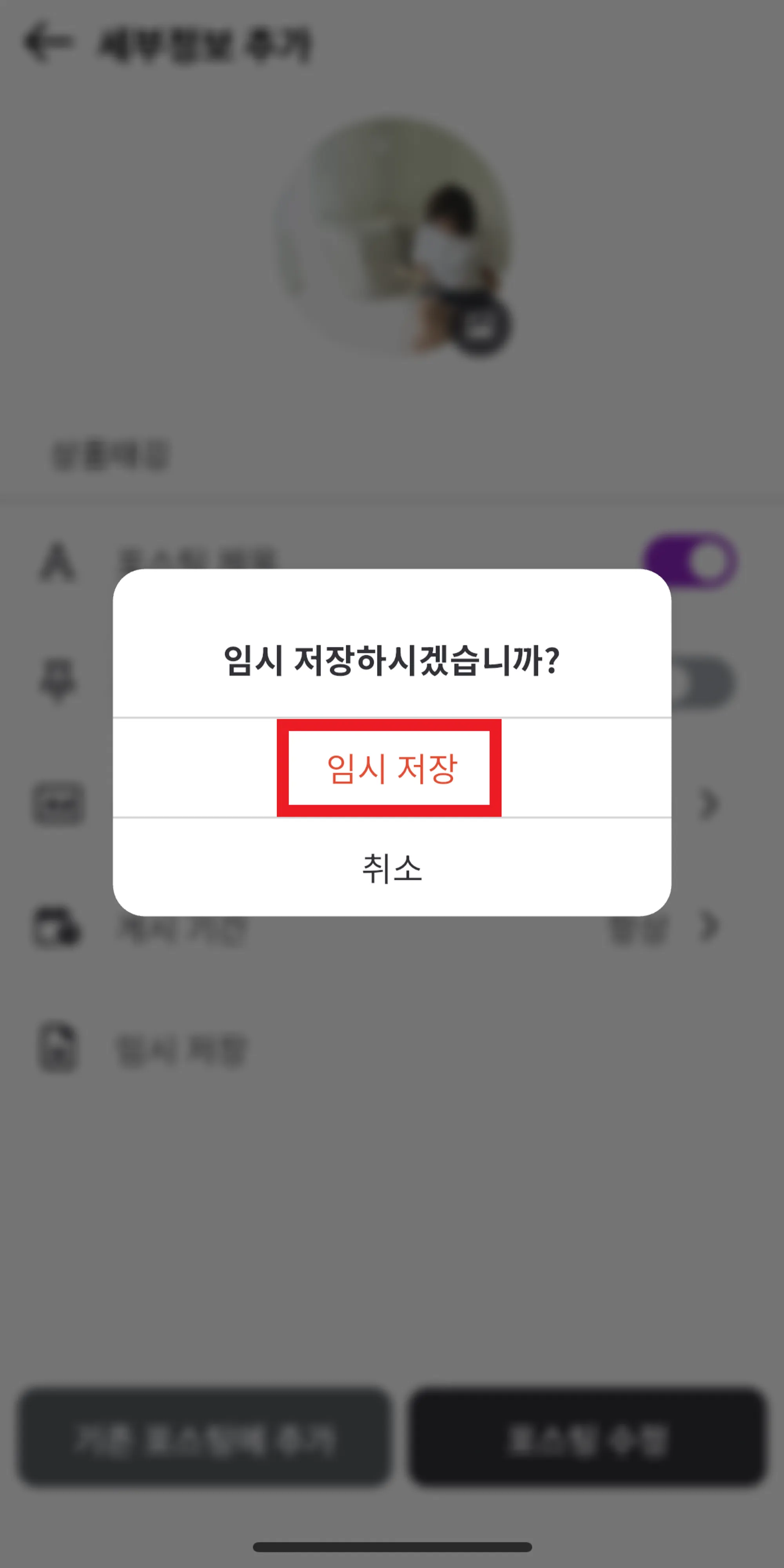 1. 포스팅, 쇼츠 업로드 전, “세부정보 추가”단계에서 “임시 저장”을 터치합니다.