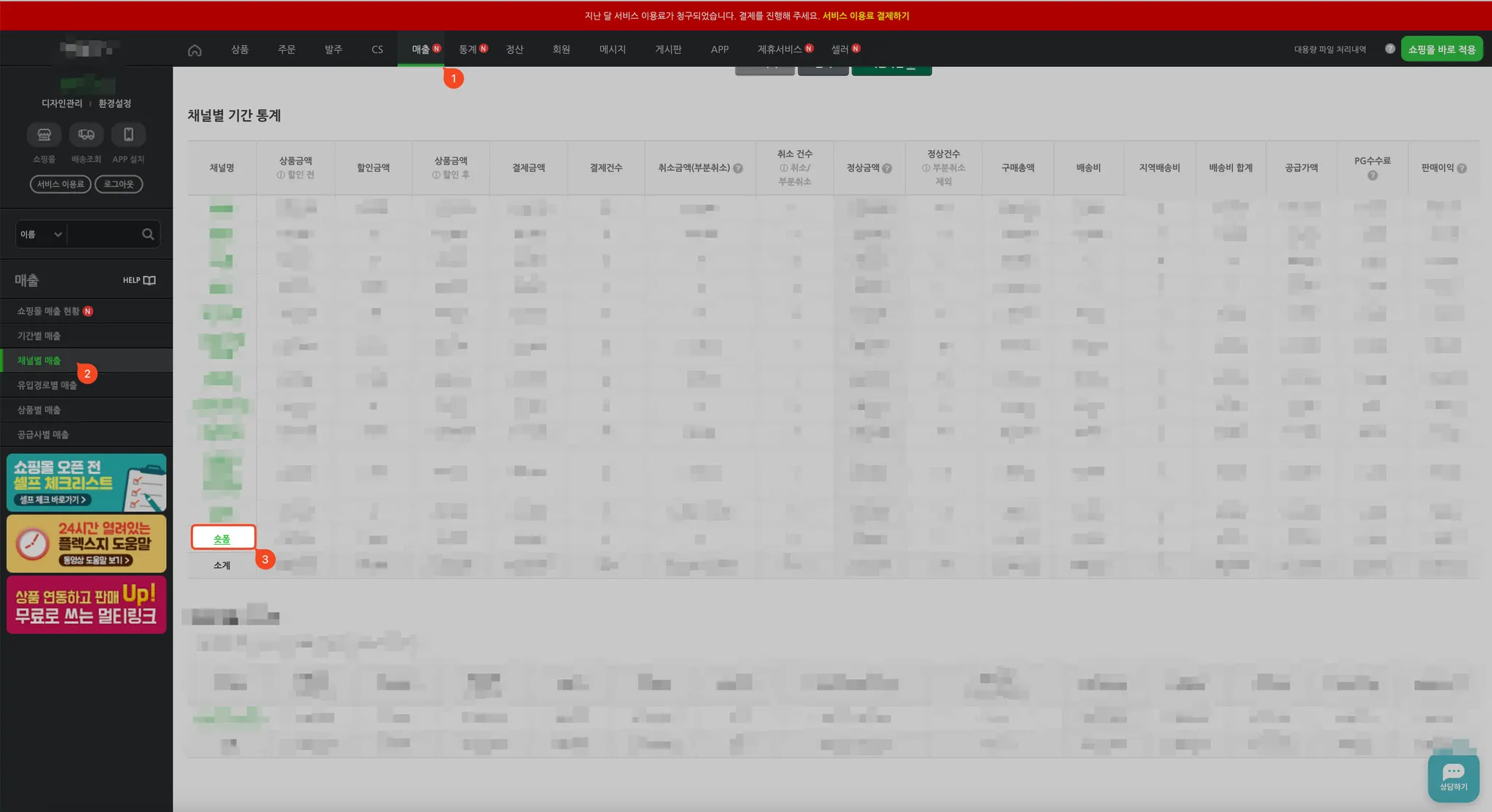 플렉스지 [매출] 메뉴의 [채널별 매출]에서 1번에서 설정한 이름으로 구매전환을 확인하실 수 있습니다.
