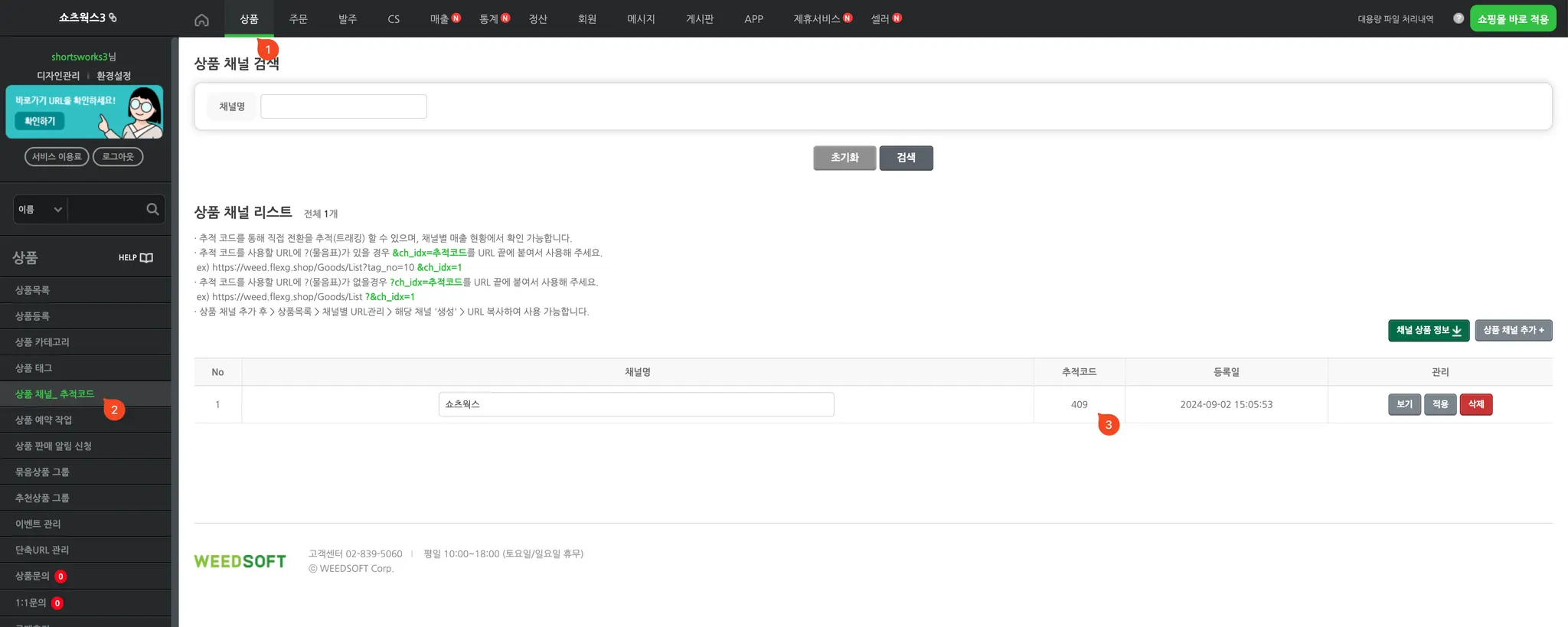 쇼츠웍스에 해당 상품 채널 추적 코드 입력하기