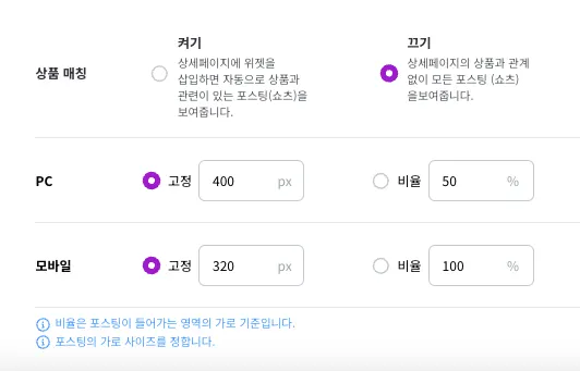 단일포스팅(임베드)의 형태로 상세페이지 등에 넣는 경우는 [위젯설정] - [위젯 삽입] 메뉴의 속성에서 관련 너비를 정하실 수 있습니다.