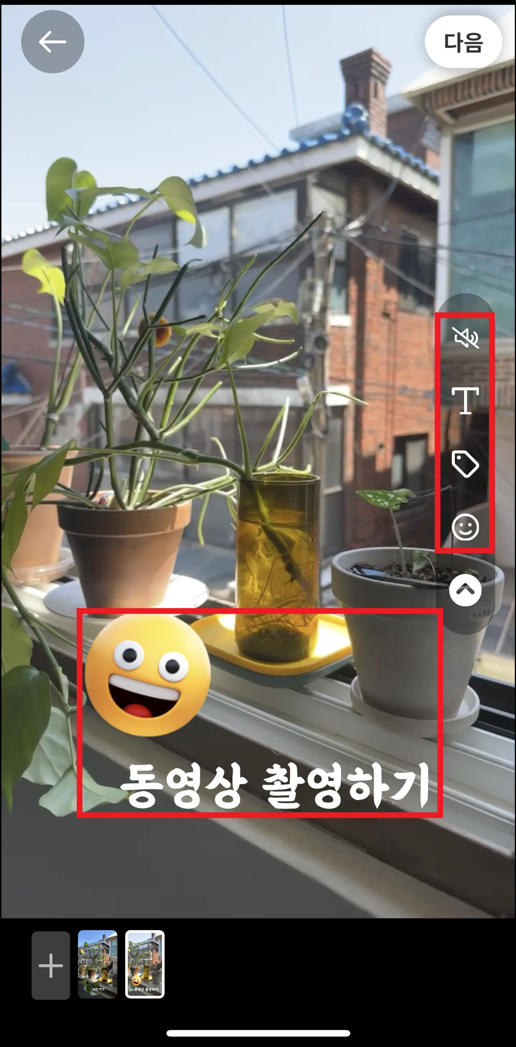 5. 영상길이 조절 후 텍스트 입력, 상품태그, 이모지 추가가 가능합니다. 동영상은 음소거를 선택할 수 있습니다.