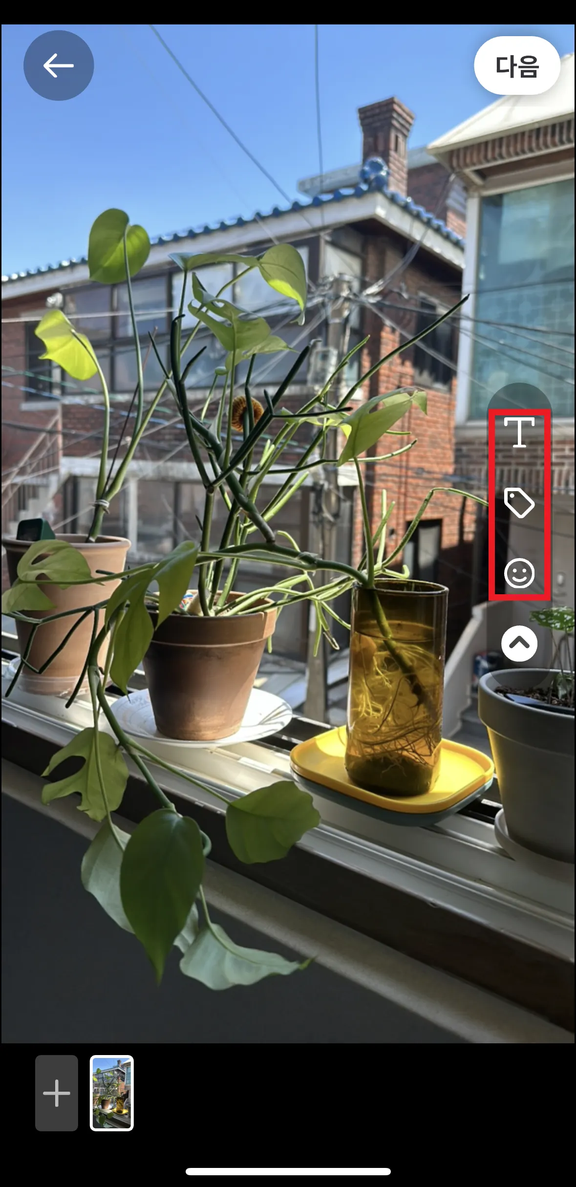 3. 촬영된 사진 확인 후 우측 툴바에서 텍스트 입력, 상품태그, 이모지 추가가 가능합니다.