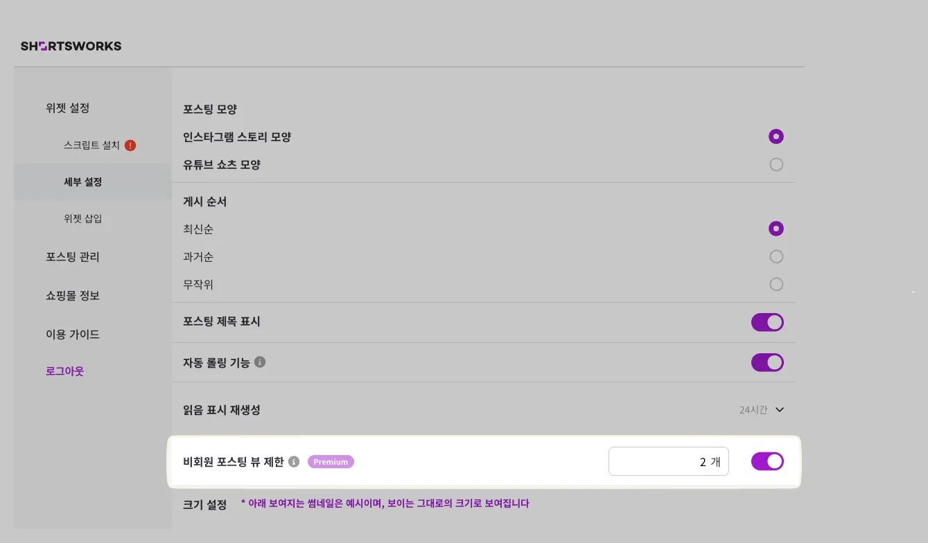 비회원 포스팅 제한 옵션을 켜고, 몇 개의 쇼츠를 보면 회원가입 유도 버튼이 나타날지 지정하면 됩니다.